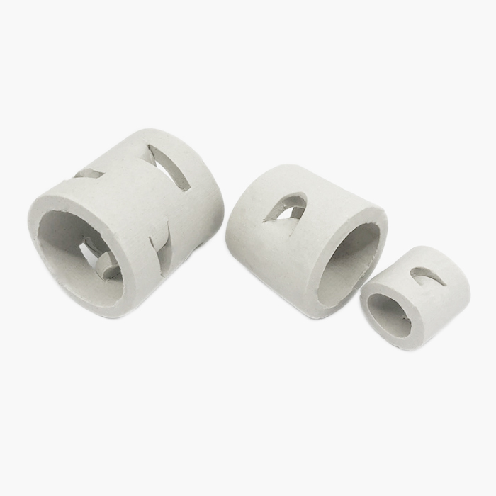 陶瓷鮑爾環(huán)填料是在陶瓷拉西環(huán)的基礎(chǔ)上開(kāi)發(fā)的一種高徑相等的開(kāi)孔環(huán)型填料,每層窗孔有5個(gè)舌葉,每個(gè)舌葉內(nèi)彎指向環(huán)心,上下兩層窗孔的位置相反錯(cuò)開(kāi),一般開(kāi)孔面積約占環(huán)壁總面積的30%左右,使得填料塔內(nèi)的氣體和液體能夠從窗孔自由通過(guò),改善了氣液分布,充分利用了環(huán)的內(nèi)表面。