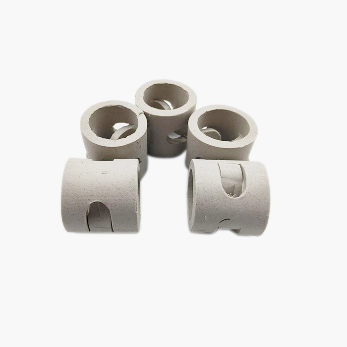 陶瓷鮑爾環(huán)填料是在陶瓷拉西環(huán)的基礎(chǔ)上開(kāi)發(fā)的一種高徑相等的開(kāi)孔環(huán)型填料,每層窗孔有5個(gè)舌葉,每個(gè)舌葉內(nèi)彎指向環(huán)心,上下兩層窗孔的位置相反錯(cuò)開(kāi),一般開(kāi)孔面積約占環(huán)壁總面積的30%左右,使得填料塔內(nèi)的氣體和液體能夠從窗孔自由通過(guò),改善了氣液分布,充分利用了環(huán)的內(nèi)表面。