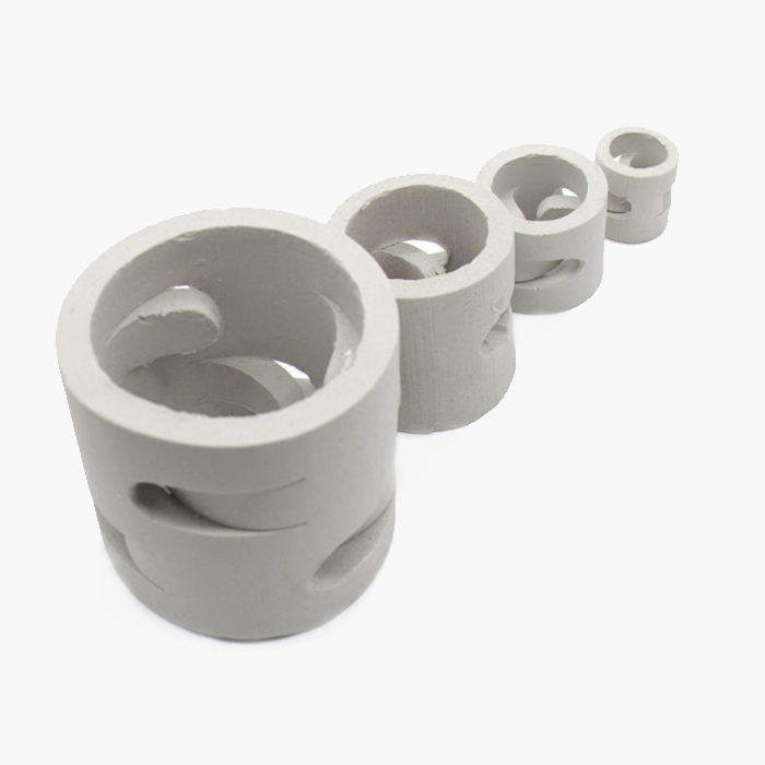 陶瓷鮑爾環(huán)填料是一種高徑相等的開孔型填料,每層窗孔有5個(gè)舌葉,每個(gè)舌葉內(nèi)彎指向環(huán)心,上下兩層窗孔的位置相反錯(cuò)開,一般開孔面積約占環(huán)壁總面積的30%左右。這種結(jié)構(gòu)改善了汽液分布,充分利用了環(huán)的內(nèi)表面,從而使得填料塔內(nèi)的氣體和液體能夠從窗體自由通過。