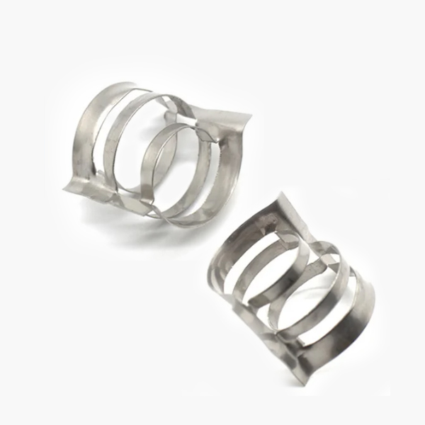 金屬共軛環(huán)填料揉合了環(huán)形和鞍形填料的優(yōu)點(diǎn),采用共軛曲線肋片相結(jié)構(gòu),兩端外卷邊及合適的長(zhǎng)徑比、填料間或填料于踏壁間均為點(diǎn)接觸,不會(huì)產(chǎn)生疊套、孔隙均勻、阻力小、亂堆時(shí)取定向排列,故有規(guī)整填料的特點(diǎn),有較好的流體力學(xué)和傳質(zhì)性能。