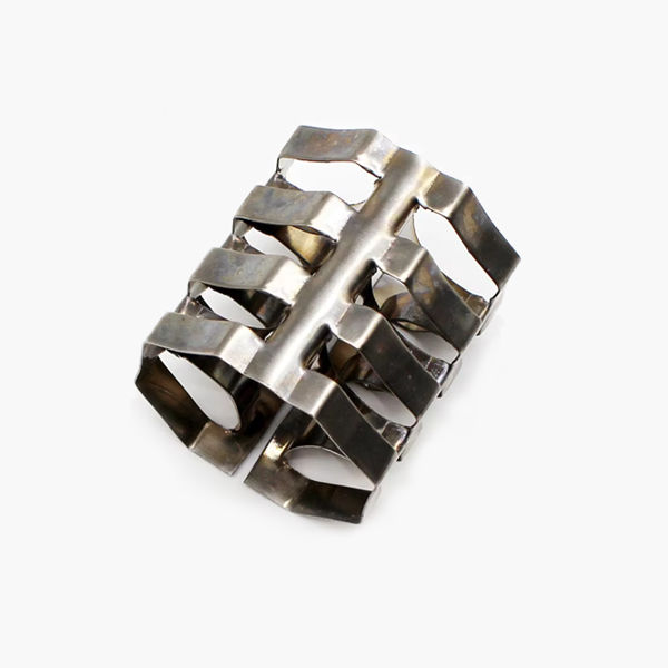 金屬八四內(nèi)弧環(huán)填料,也稱麥勒環(huán)填料,是一種新型高效金屬散堆填料,該填料有合理的幾何對(duì)稱性,構(gòu)造均勻性好及高的空隙率,八弧卷與四弧圈順軸向交替安排,名弧段沿徑向環(huán)內(nèi)折進(jìn),從而使填料表面連續(xù)而不斷開(kāi),且在空間均勻分布,與鮑爾環(huán)相比,通量可提高15-30%,壓降減小20-30%。
