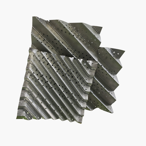金屬孔板波紋填料是在金屬薄板表面開孔、軋制小紋、大波紋最后組裝而成的規(guī)整填料,具有阻力小、氣液布均勻、效率高、能量大、放大效應不明顯等特點,應用于負壓、常壓和加壓操作。